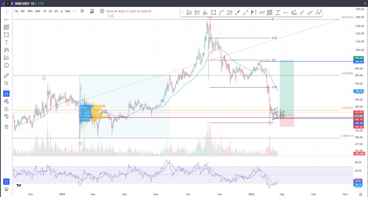 ###**🪙**** BNB — готовлю среднесрочную позицию от зоны 0.382** Цена сейчас как раз **подошла к золотому сечению (0.382)** и уже сняла приличный объём, который копился ещё с начала прошлого года. Это __похоже на классическую разгрузку__ перед движением — крупные игроки потихоньку выходят, рынок реагирует. **🎯**** Ближайшая цель — район 960$ (0.5 по Фибо)** Там хорошая ликвидность, сильный уровень и логичная зона, куда могут протянуть цену перед продолжением основного тренда. **Именно туда и хочу зайти.** **📈**** Вход планирую от зелёной зоны** — отметила её на скрине. Это удобное место, где цена может дать __небольшой откат__ и сформировать точку для входа по всем правилам. **🧠**** Глобально — без эйфории** Даже если сходим к 960$, я всё ещё смотрю на это как на **коррекцию в рамках более широкого медвежьего рынка.** Просто хочу __аккуратно забрать это движение вверх__, а дальше уже смотреть на реакцию и структуру.