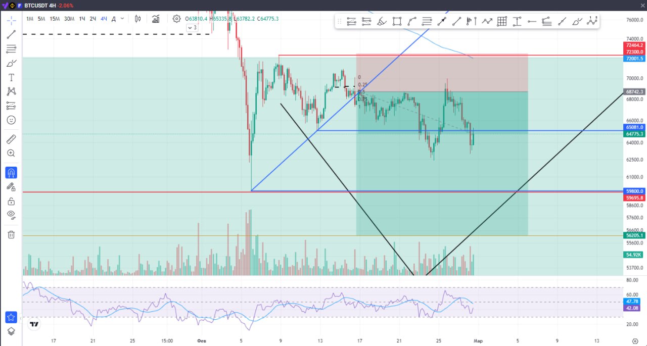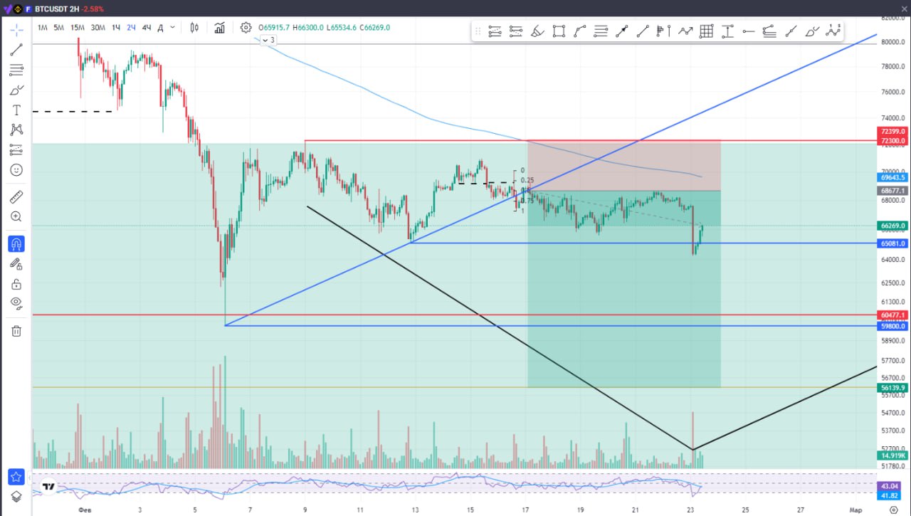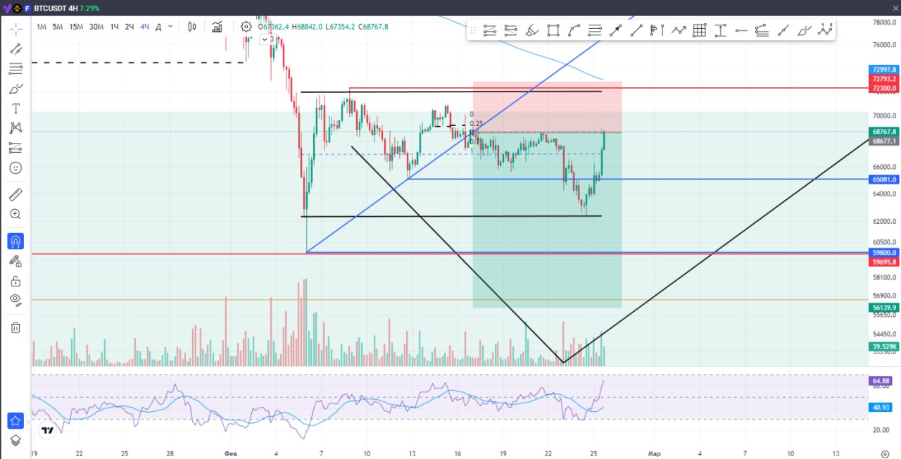 ###**📈**** BTC — СНОВА У ВХОДА** Цена вернулась в точку входа. Рынок снова застрял в диапазоне и пока не даёт чёткого направления. На самом деле, ничего странного — перед сильным движением часто **тестируют нервы** и уровни. Если честно, трудно сказать, что именно спровоцировало этот рост. После выступления Трампа вроде бы давили вниз, а рынок развернулся и пошёл наверх. Лишний раз убеждаюсь: **рынок непредсказуем**, и с этим просто надо жить. Сейчас мы чётко в коридоре **$72 000 – $62 000**, и цена болтается внутри, не решаясь выйти. ❓** ЧТО ДАЛЬШЕ**❓ Не исключаю, что можем сходить чуть выше — к **EMA 200** и оттуда уже будет логичнее ждать реакцию вниз, в сторону **$59 800**. **💡**** Важное наблюдение:** __Обратите внимание на длинные тени на графике. Такие фитили часто работают как **магниты** — цена любит возвращаться и «зализывать» их. Так что возврат в эти зоны будет вполне по красоте ____📉__