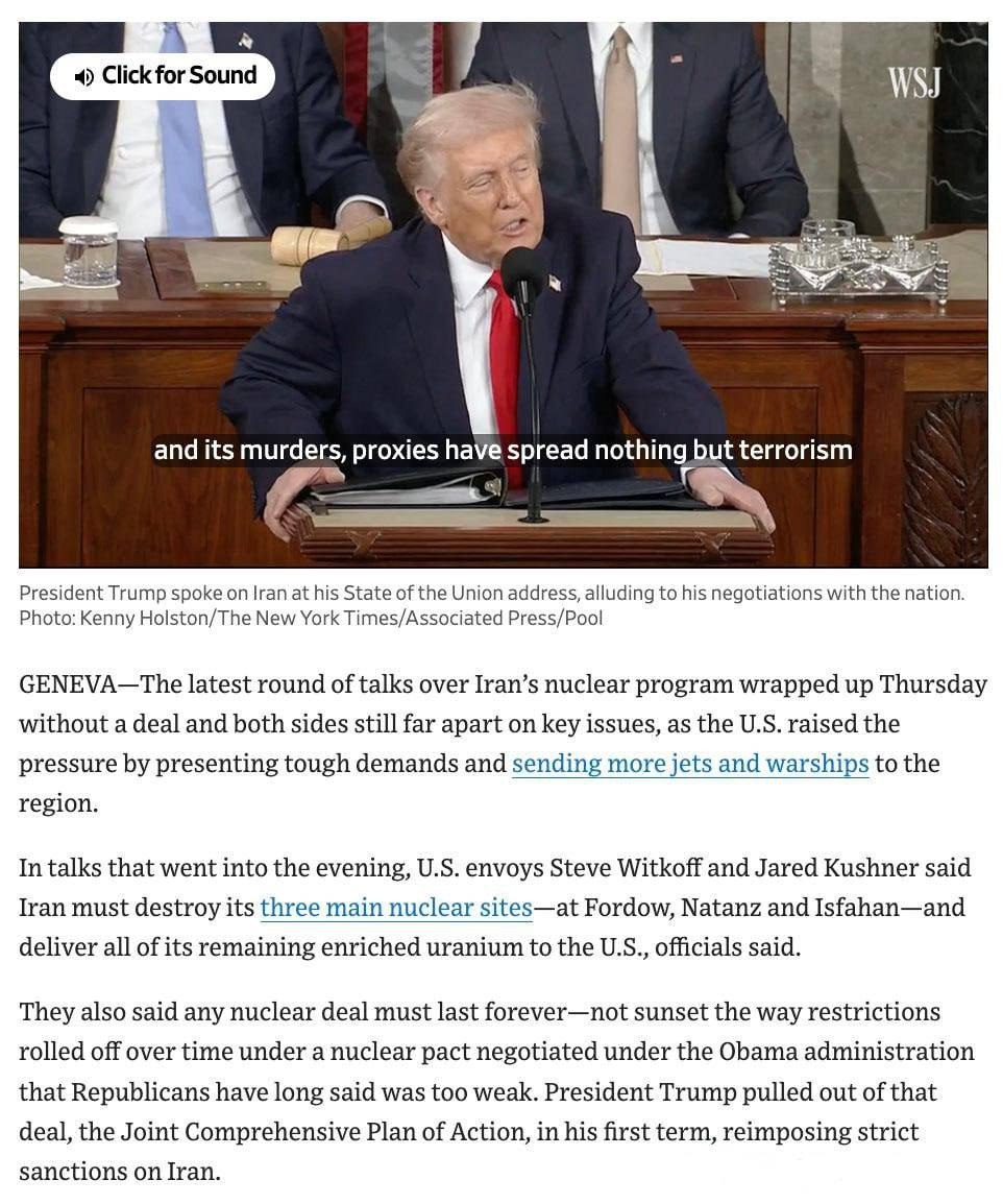 ###**США vs Иран** 🇺🇸🇮🇷 ➠ США продолжают одновременно вести переговоры с Ираном по ядерной программе и увеличивать военное присутствие на Ближнем Востоке. ➠ Дипломатия пока не может разрешить слишком глубокие противоречия между странами, это сильно повышает вероятность вооруженного конфликта. ➠ В ближайшие дни истечет «10-15 дней», которые Дональд Трамп предоставил Тегерану на заключение сделки, после чего могут последовать удары по ядерной и военной инфраструктуре. ➠ Прошедшие в Женеве переговоры США и Ирана завершились без заключения сделки по иранской ядерной программе. Обе стороны по-прежнему расходятся во мнениях по ключевым вопросам. ➠ Новый раунд переговоров запланирован на понедельник (2 марта).