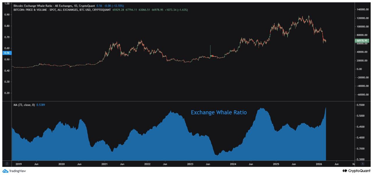 ###Коэффициент обмена BTC достиг рекордно высокого уровня. Этот спад вынудил розничных инвесторов покинуть рынок. Сейчас на рынке доминируют киты, оставляя только умных инвесторов. Соотношение китов осталось почти на том же уровне, что и в сентябре 2024 года. После этого BTC вырос с 52 тысяч до 110 тысяч. Коэффициент биржевого кита указывает на то, что текущий уровень находится почти на дне.