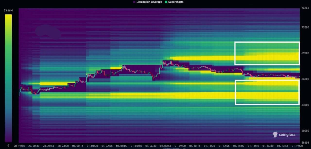 ###🤑** По BTC карта ликвидаций выглядит достаточно сбалансированной. ** Снизу скопление ликвидности в зоне 63 500–64 000. Если фьючерсы США откроются слабее и потянут рынок вниз, именно этот кластер могут снять первым. После зачистки нижней ликвидности логичным сценарием станет движение кверху - в область 69 000, где сосредоточены стопы шортов и верхняя ликвидность.